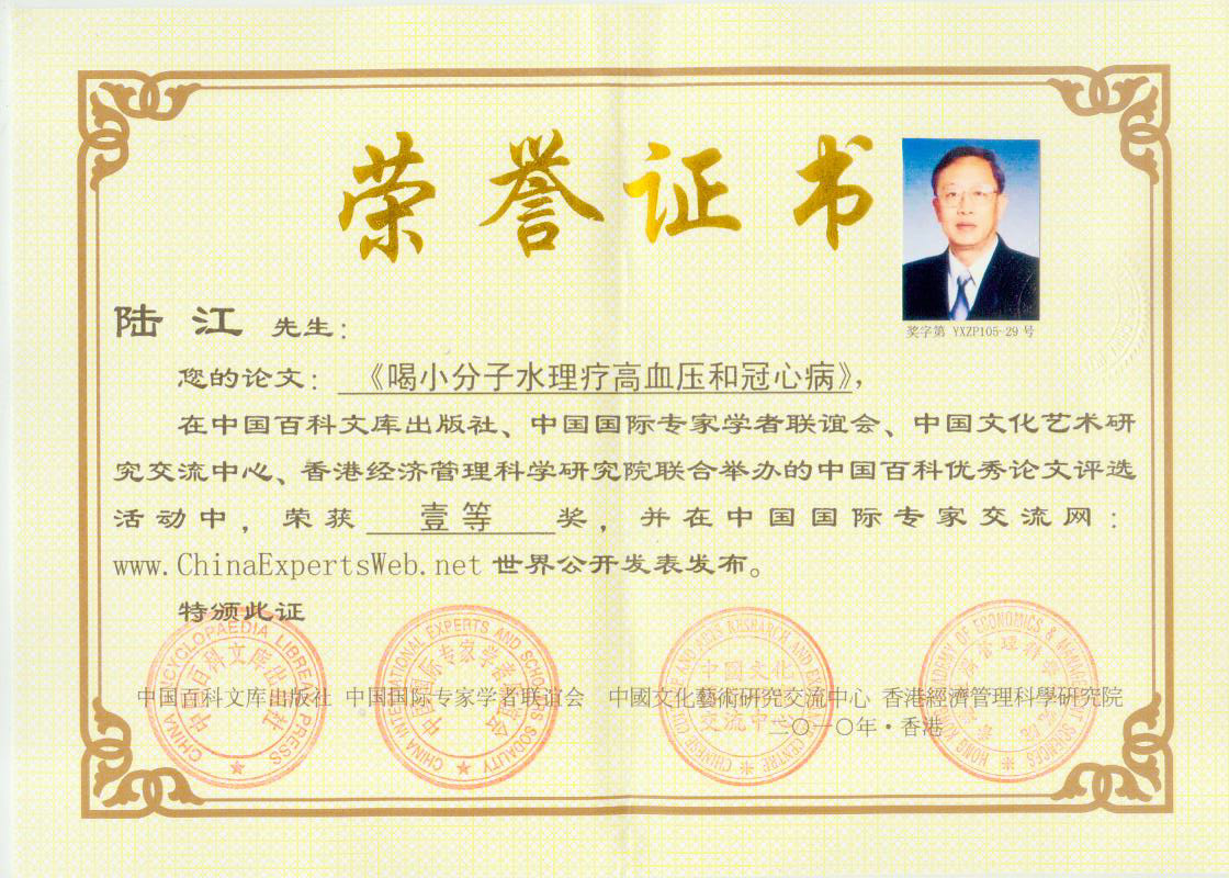 -----我是從事建筑的高工,本來沒有資格去攻克醫(yī)學(xué)難題,卻為了自身健康才扣響醫(yī)學(xué)的大門。由于我1990年患高血壓,因怕中風(fēng)才研究發(fā)明了離子水瓶,我把水處理成微小分子團(tuán)水,飲用后治愈了高血壓。便于1993年底送到三家省級醫(yī)院做臨床試用4個月。經(jīng)北京和廣西醫(yī)學(xué)專家鑒定:"降脂降壓效果好"," 能擴(kuò)大心腦動脈流量,改善心腦電圖以及微循環(huán)","對治療心腦動脈粥樣硬化、高血壓、高血脂有良好的醫(yī)療保健作用。""產(chǎn)品的技術(shù)性能和療效達(dá)到了同類產(chǎn)品的國內(nèi)領(lǐng)先水平,經(jīng)廣西醫(yī)學(xué)科學(xué)情報研究所檢索,未見國外有類似報道。"中國醫(yī)學(xué)科學(xué)院張正國教授從美國國立醫(yī)學(xué)圖書館數(shù)據(jù)庫存Medline檢索英俄文資料,均未見類似報告。2000年上市后,我為了對消費者負(fù)責(zé)而繼續(xù)觀察研究,一直通過《信譽卡》和《質(zhì)量跟蹤調(diào)查書》向患者承諾療效,請用戶使用6個月后反饋效果。和脂壓患者飲用2至5個月內(nèi),消除癥狀,停服藥物,血壓正常;冠心病患者飲用3~5個月逐漸減輕至消除心絞痛、房顫等癥狀,不再服藥,飲用1年左右心電圖正常,經(jīng)冠脈造影掃描無明顯狹窄,表明冠心病痊愈。大量患者還反映許多衰弱器官被修復(fù),讓前列腺增生、慢性咽喉炎、慢性氣管炎、支氣管炎、慢性胃炎、腸炎和膽囊炎等不藥而愈;2型糖尿病患者是因為胰島衰弱致病,飲用該水半年至一年,逐漸減藥至停藥,血糖尿糖正常,真正治愈2型糖尿病。中風(fēng)后遺癥患者飲用六七個月,可逐漸減輕至消除肢體和語言障礙,表明飲用該水能讓壽命很長的神經(jīng)元細(xì)胞逐漸修復(fù),奇跡般地恢復(fù)肢體和語言功能。飲用后還使胸腺和脾臟兩個重要的免疫器官被修復(fù)和增強(qiáng),產(chǎn)生免疫細(xì)胞多,提高了免疫力,使人不生病或少生病。自此, 飲用微小分子團(tuán)水創(chuàng)造了攻克冠心病、高(低)血壓和糖尿病三大醫(yī)學(xué)難題的奇跡。人們對此感到不可思議,但實踐是檢驗真理的唯一標(biāo)準(zhǔn)。
